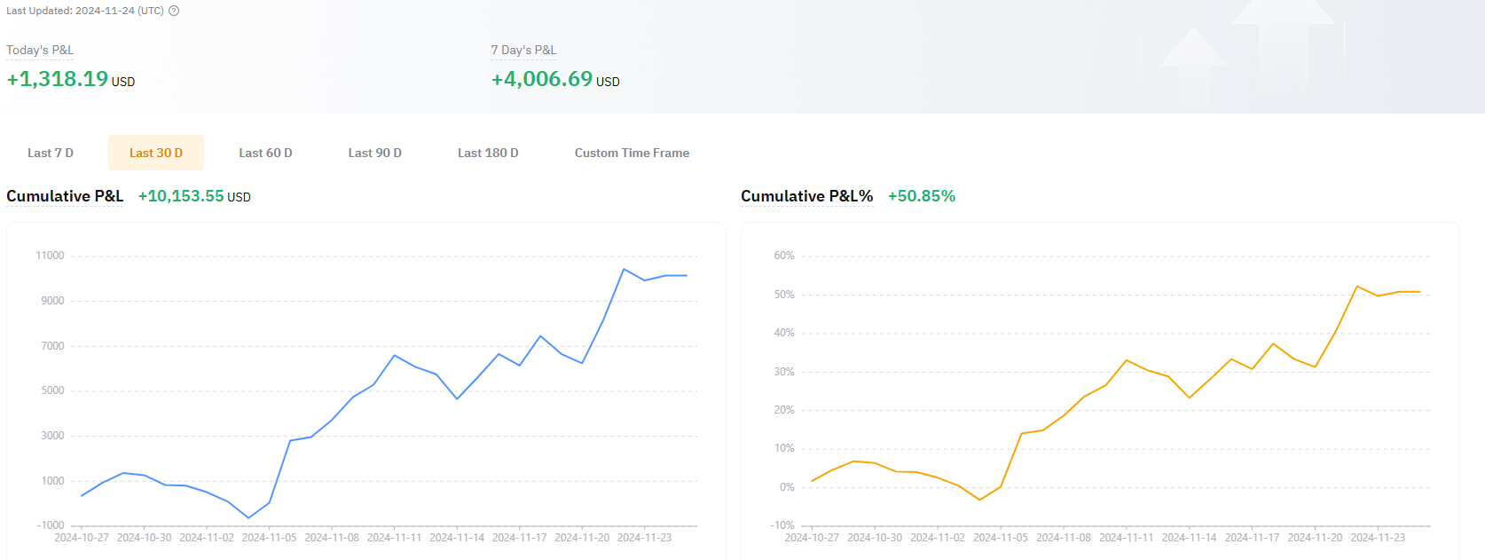 The performance over the last 30 days of our AI shows quiet good results. The average used capital for the macro account is between USD 2500 and USD 4000. The parameters are adjusted daily depending on the market situation by our experts in order to retrieve the maximum profit.